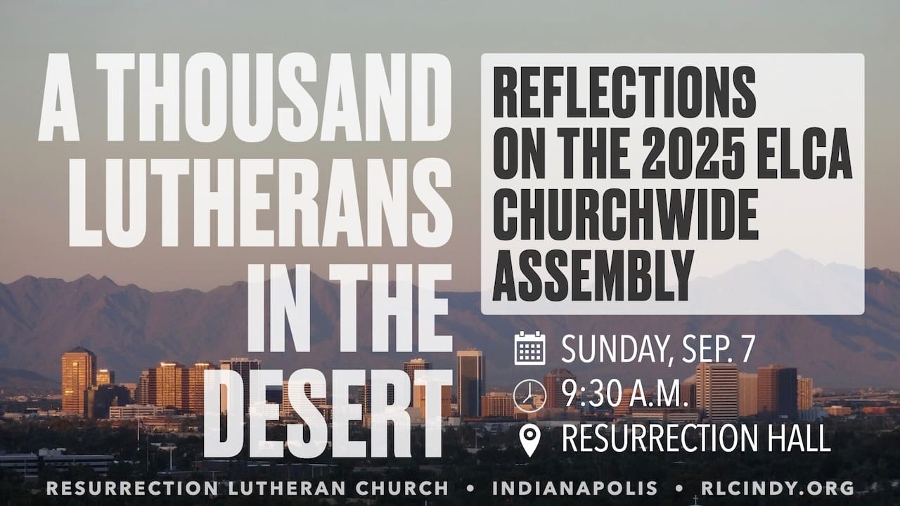 Sunday, Sep. 7, 9:30 a.m. in Resurrection Hall: The Churchwide Assembly of the ELCA meets every three years and Pastor Ryan traveled to Phoenix to volunteer at this year’s assembly. He will share some about his experiences there, but mostly about important decisions made to guide the life of our church.