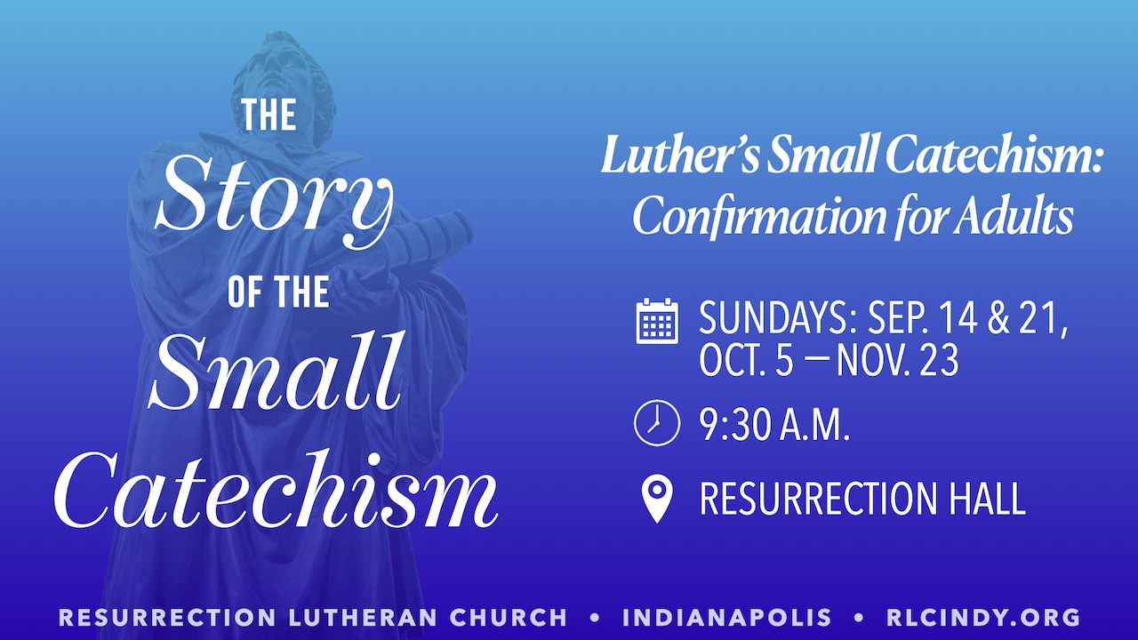 Sundays this fall, Sep. 14 & 21, Oct. 5 – Nov. 23, 9:30 a.m. in Resurrection Hall: What is the Small Catechism—and why does it still matter? Join the pastors this fall on Sunday mornings for a new series exploring Martin Luther’s Small Catechism. Each week includes a short video and guided discussion. All are welcome—no prep needed, come as you’re able.